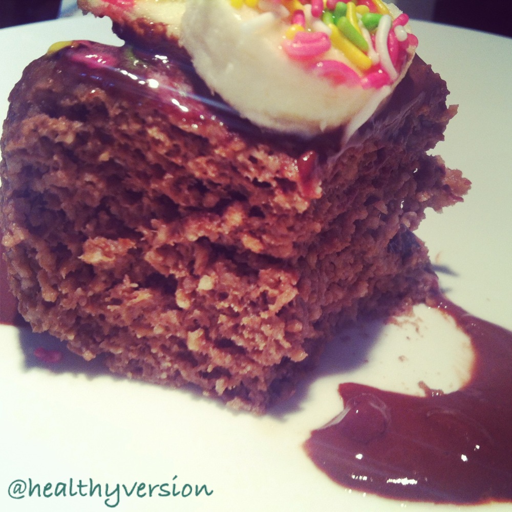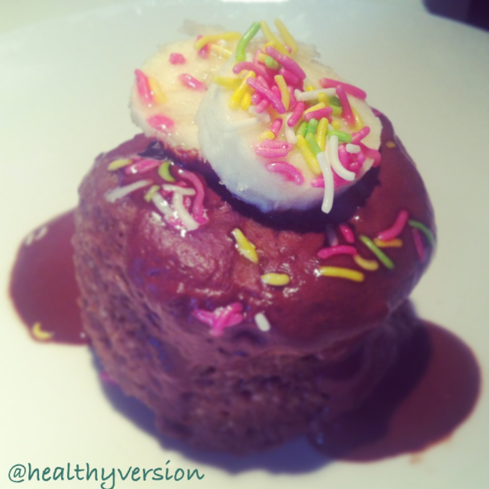 Βάζουμε όλα τα υλικά μας στο μίξερ και τα κάνουμε χυλό. Μετά για το ψήσιμο έχουμε 2 επιλογές. Αν είστε βιαστικοί, φούρνο μικροκυμμάτων σε μία κούπα χαμηλή, ή πύλινο (προσοχή, να μην ξεπερνάει τα 2/3 του σκεύους ο χυλός γιατί φουσκώνει!).Αν έχετε χρόνο και θέλετε πιο σκληρή κρούστα, 12-15 λεπτά στο φούρνο στους 200 βαθμούς (προθερμασμένο φούρνο). Όταν ψηθεί το βγάζετε από το σκεύος, το βάζετε σε ένα πιάτο και ετοιμάζετε την σοκολατένια σος.
