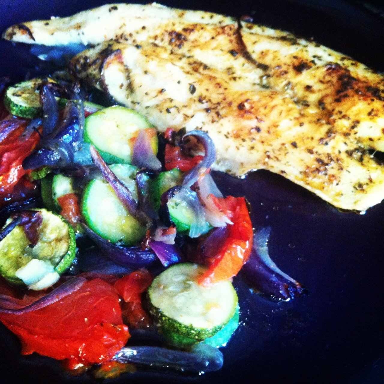 Παίρνουμε ένα μεγαλούτσικο ταψί και αρχίζουμε να κόβουμε μέσα τό κρεμμύδι σε λεπτά κομμάτια. Έπειτα κάνουμε το ίδιο με τις τομάτες και τα κολοκυθάκια. Έπειτα παίρνουμε τις γλώσσες μας, είτε από το ιχθυοπωλείο, είτε κατεψυγμένες που τις έχουμε ξεπαγώσει και τις τοποθετούμε μέσα στο ταψάκι ανάμεσα στα λαχανικά. Αν τις σκεπάζουν και λίγο δεν μας πειράζει, ακόμη καλύτερα. Αλατοπιπερώνουμε τα λαχανικά και το ψάρι, βάζουμε μπόλικη ρίγανη, λίγο βασιλικό, 1 φύλλο δάφνη και πασπαλίζουμε με την γλυκιά πάπρικα. Ρίχνουμε το λάδι και ανακατέβουμε ελαφρώς με τα χεράκια μας. Βάζουμε το ταψάκι σε προθερμασμένο φούρνο στους 180 βαθμούς για περίπου 45 λεπτά. Σερβίρουμε με πουρέ που πάει πολύ ωραία γιατί τραβάει το ζουμάκι από τα λαχανικά, ή με ρύζι!